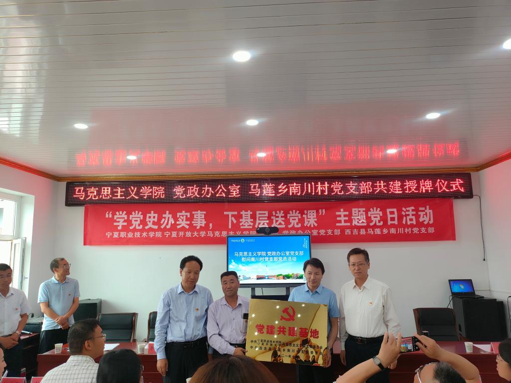 党建共建授牌仪式上,马克思主义学院党支部书记王顺和致辞,表达了共建的目的与意义;南川村党支部书记马存山表示感谢共建活动;马莲乡党委书记张志高希望南川村以党建共建以契机,提高党建水平,服务好群众。