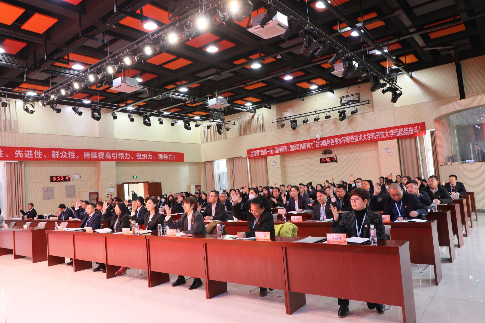 大会在激昂的《国际歌》声中圆满闭幕。这一旋律不仅是会议的尾声,更是奋进新征程的号角。本次“双代会”的成功举办,是学校民主管理、科学决策的生动实践,为学校发展注入了强大动力。站在新起点,全体教职工将以时不我待的紧迫感、舍我其谁的责任感,把会议精神转化为实际行动,聚焦“1347”战略工程,在各自岗位上发光发热。以实干笃定前行,以奋斗开启未来,为将学校建设成为“西部领先、国内一流、国际具有影响力”的中国特色高水平职业技术大学和开放大学而团结拼搏,书写学校发展新篇章,为宁夏乃至全国职业教育、开放教育发展贡献磅礴力量,向着更高目标奋勇攀登,铸就学校新辉煌!