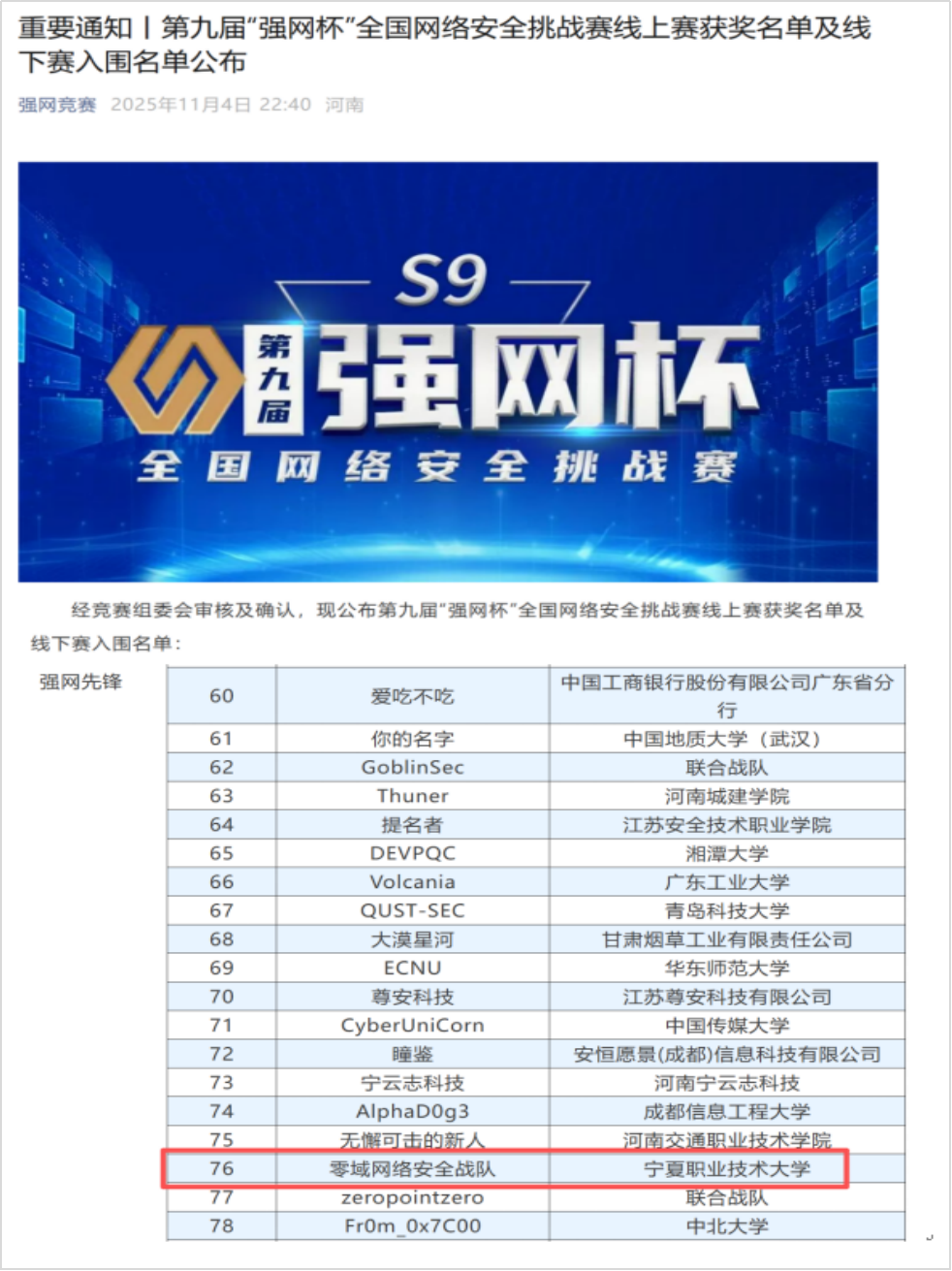 11月4日,第九届“强网杯”全国网络安全挑战赛组委会正式公布了线上赛获奖及线下赛入围名单。由我校软件学院组织,网络空间安全协会成员李明杰、王三虎、王绍宇、卢佳明、何家豪、赵子豪、杨竣翔、高文峻、刘兴龙、田玉宝共同组建的“零域网络安全战队”,凭借扎实的技术功底和出色的实战能力,成功荣获全国“强网先锋”称号。在与清华大学、浙江大学等知名高校的激烈竞争中,该战队以全国排名第76位的优异成绩脱颖而出,不仅稳居自治区榜首,更成为本届赛事中宁夏回族自治区唯一获奖的战队,为学校及自治区赢得了重要荣誉。
