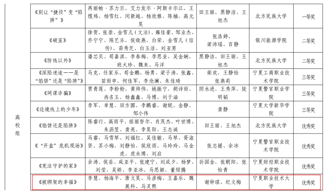 近日,自治区教育厅公布了第十届学生“学宪法讲宪法”系列比赛活动获奖名单。其中,由宣传统战部杨晓红老师指导的商学院学生金鑫喜获“全区大中小学演讲比赛”高校组宁夏赛区三等奖;由马克思主义学院谢钟琪、纪文梅老师指导,李慧、杨海平、唐文昊、马彦梅、王嘉乐、魏展科、马灵熙七位同学参与的作品《被绑架的幸福》喜获“全区大中小学法治情景剧比赛”高校组优秀奖。