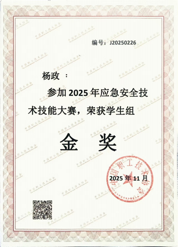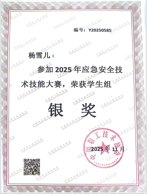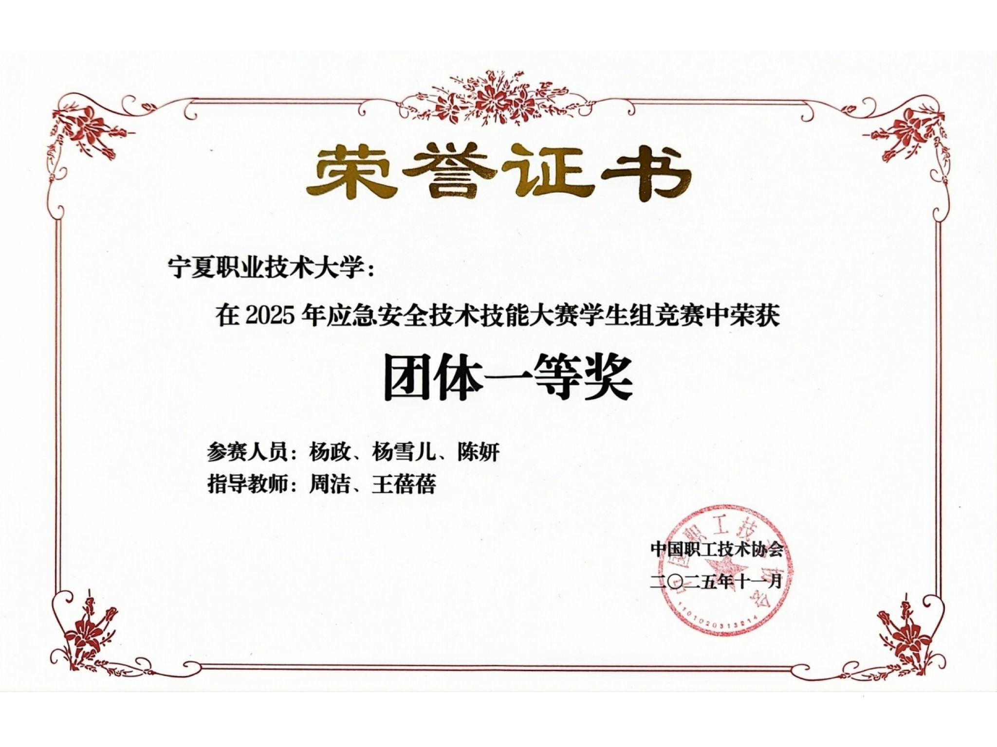 近日,2025年全国应急安全技术技能大赛决赛在河北省安全实训基地圆满落幕。由工业工程学院24级安全班杨雪儿、24级应化班杨政及陈妍组成的宁夏职业技术大学代表队凭借扎实的专业功底、默契的团队协作和出色的临场发挥,在全国众多参赛队伍中脱颖而出,斩获学生组团体一等奖第一名,同时收获个人金奖1项、银奖2项,用实力彰显了学校应急安全领域人才培养的过硬水准。