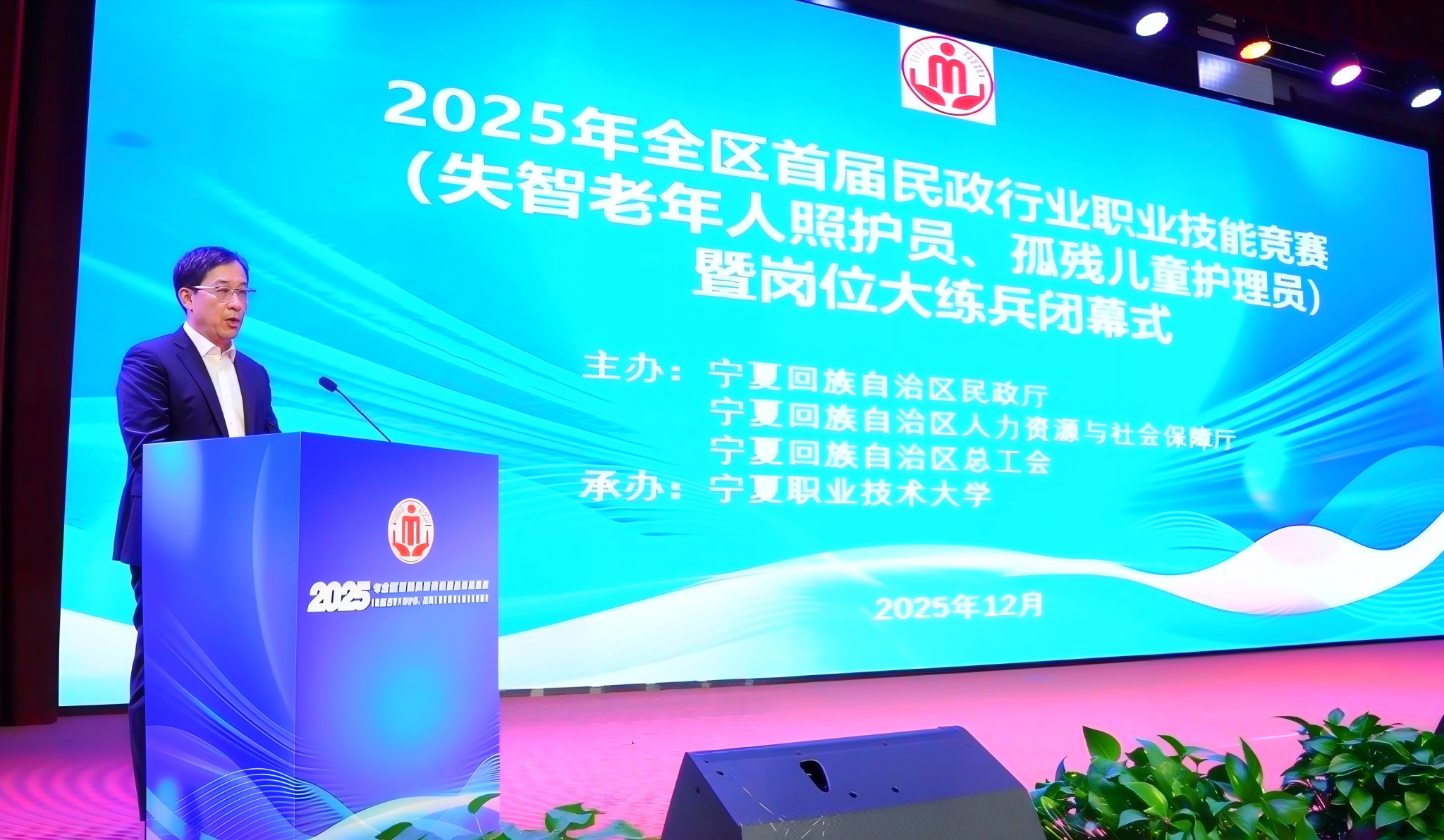 12月18日至19日,由自治区民政厅、人力资源和社会保障厅、总工会联合主办,我校承办的2025年全区养老护理员(失智老年人照护员)技能竞赛在银川圆满收官。19日下午,自治区民政厅副厅长张进军,学校校长袁正国、副校长李晓延出席闭幕式并颁奖,自治区民政厅、人社厅、总工会相关处室负责人及来自全区五市的百余位参赛选手齐聚宁职校园,以赛竞技、以赛交流,展现了新时代养老护理从业者的专业素养与人文情怀。