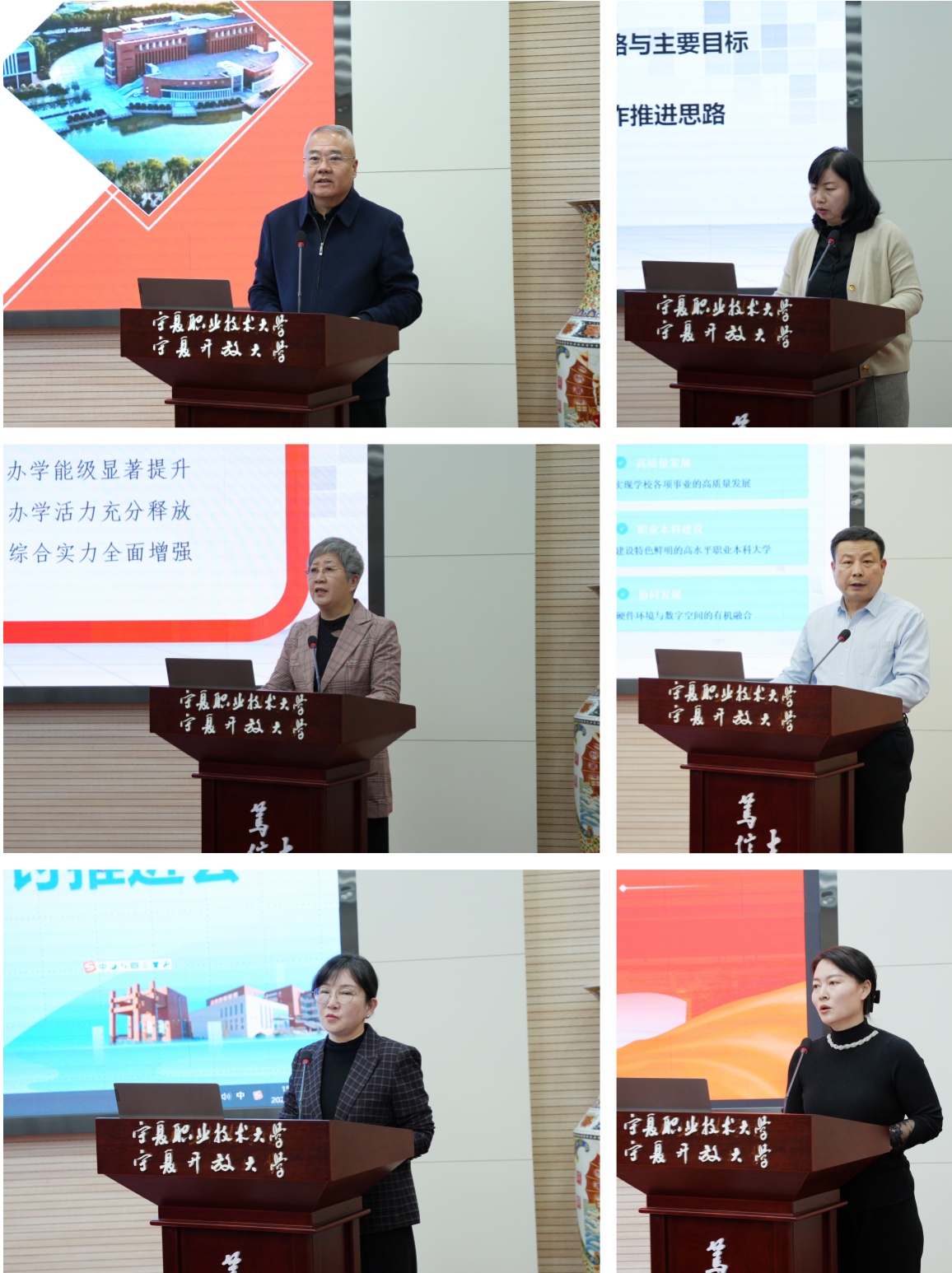 会上,苏晓军副书记、李晓延副校长、陈灿副校长以及相关部门负责人分别围绕学校“十五五”总体规划、专项规划编制情况作汇报。汇报聚焦学校发展定位,紧扣职业本科建设核心任务,系统梳理了规划编制的基础与方向。与会领导围绕规划科学性、前瞻性与可操作性展开深入研讨,为进一步完善规划蓝图凝聚了共识。