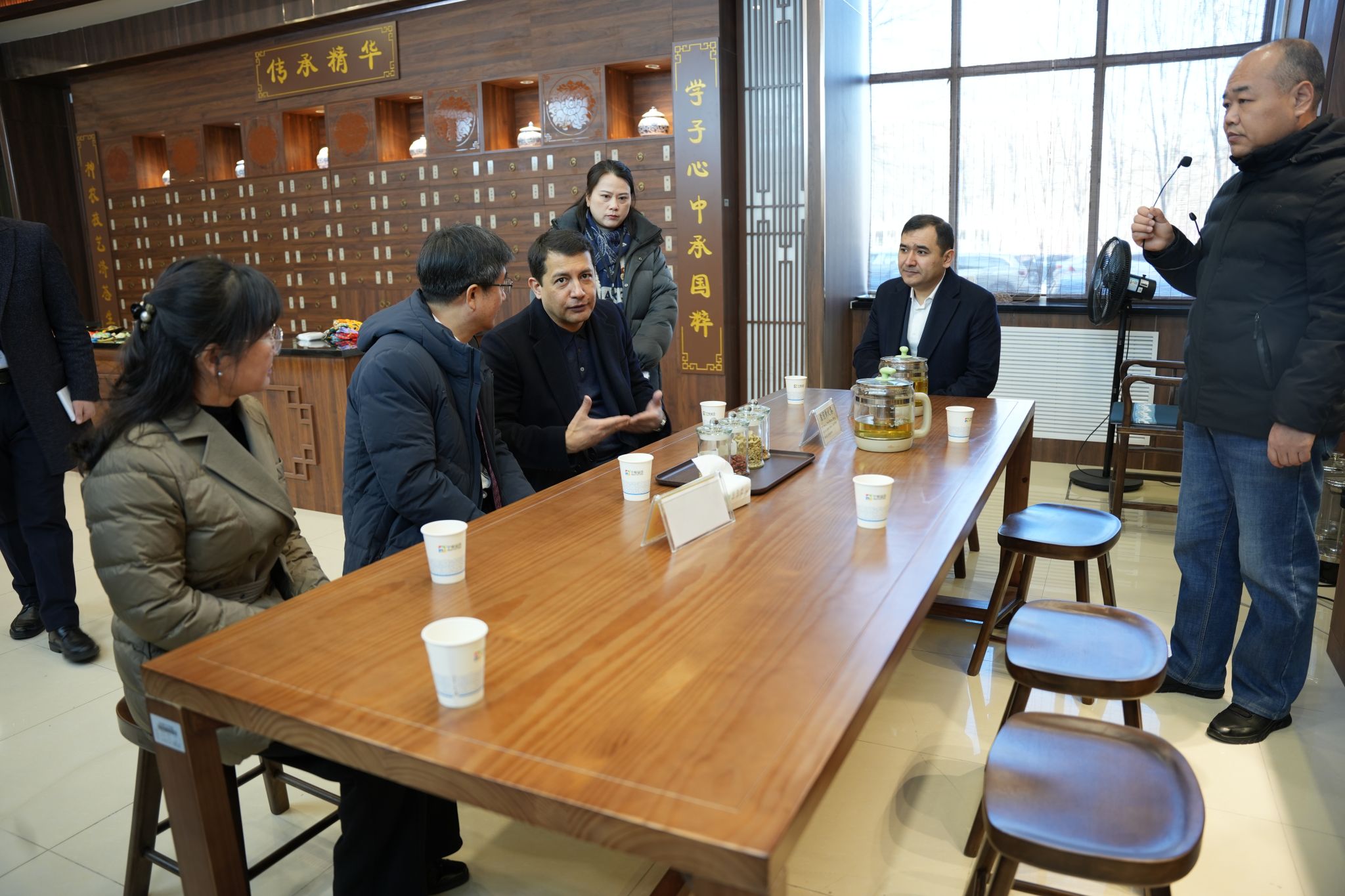大使一行先后参观了校史馆、中医药文化体验中心及智能制造实训中心。在校史馆,阿尔济耶夫大使详细了解学校发展历程与国际化办学成果;在中医药文化体验中心,亲身体验中国传统医药文化,品鉴特色养生茶饮;在智能制造实训中心,对学校在先进制造、工业机器人等领域的技术创新与人才培养模式表示高度认可。