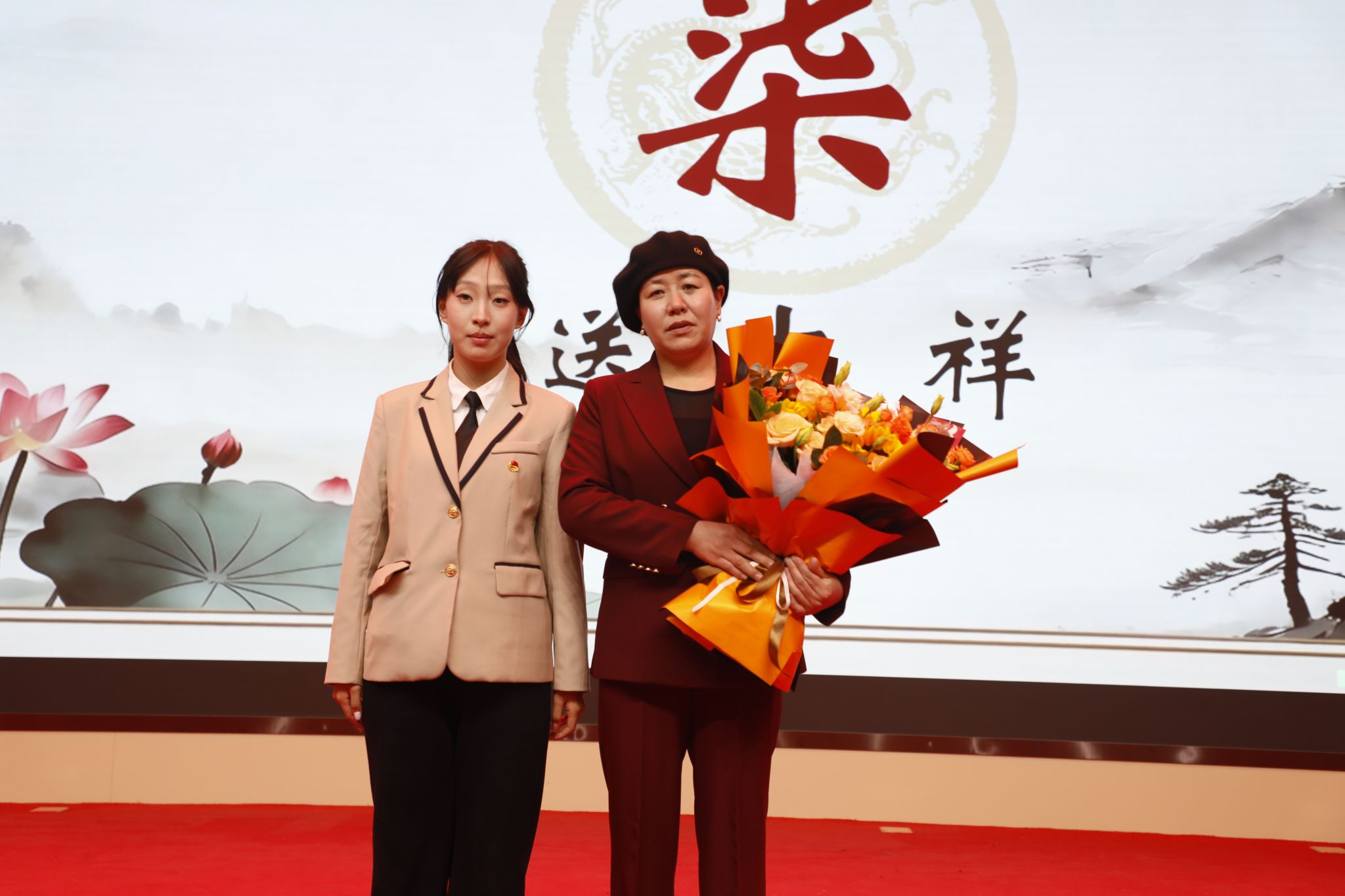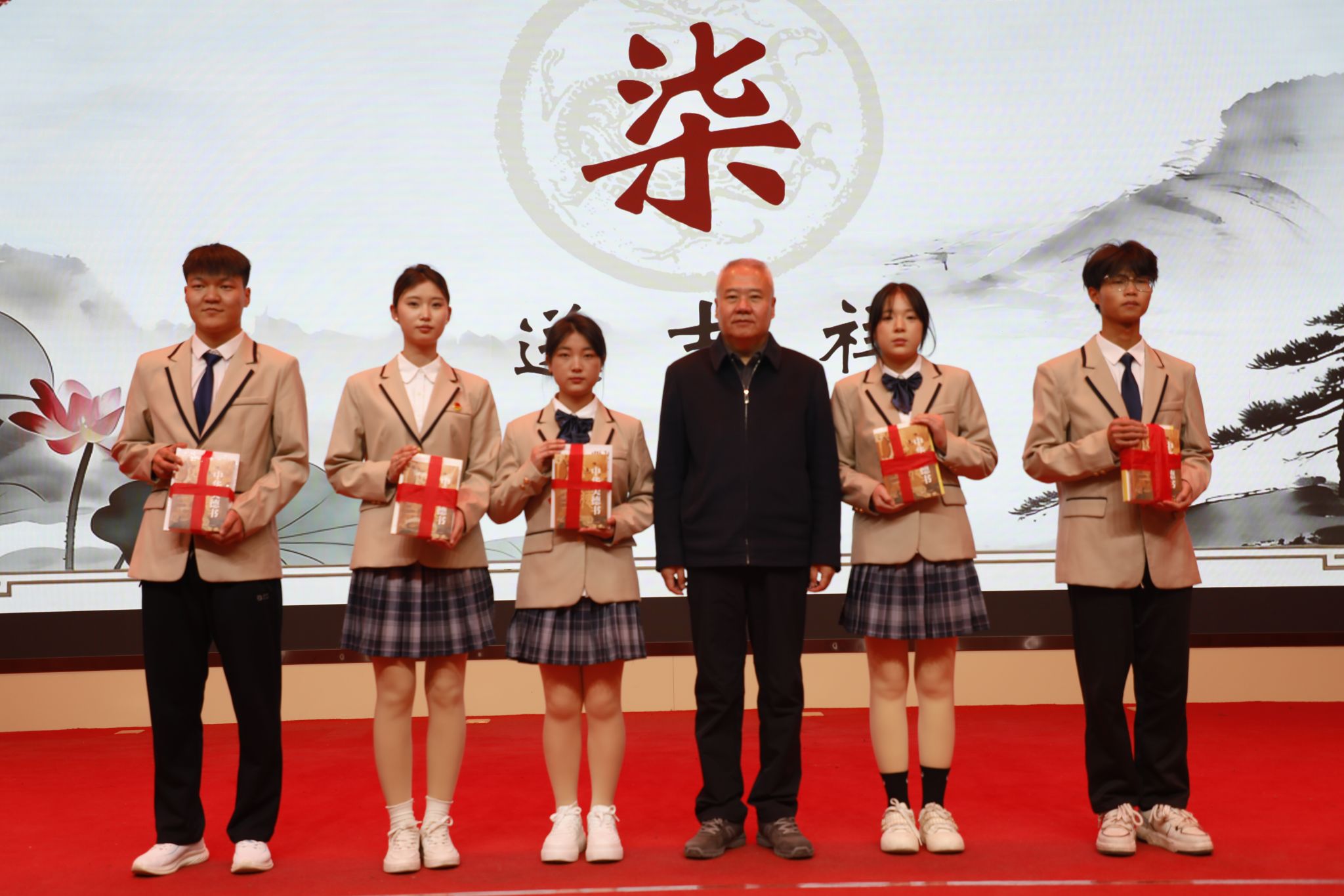 活动最后,与会领导和学生向师生代表赠送鲜花、吉祥物,寓意孝老尊亲的美好祝愿在校园里代代相传。