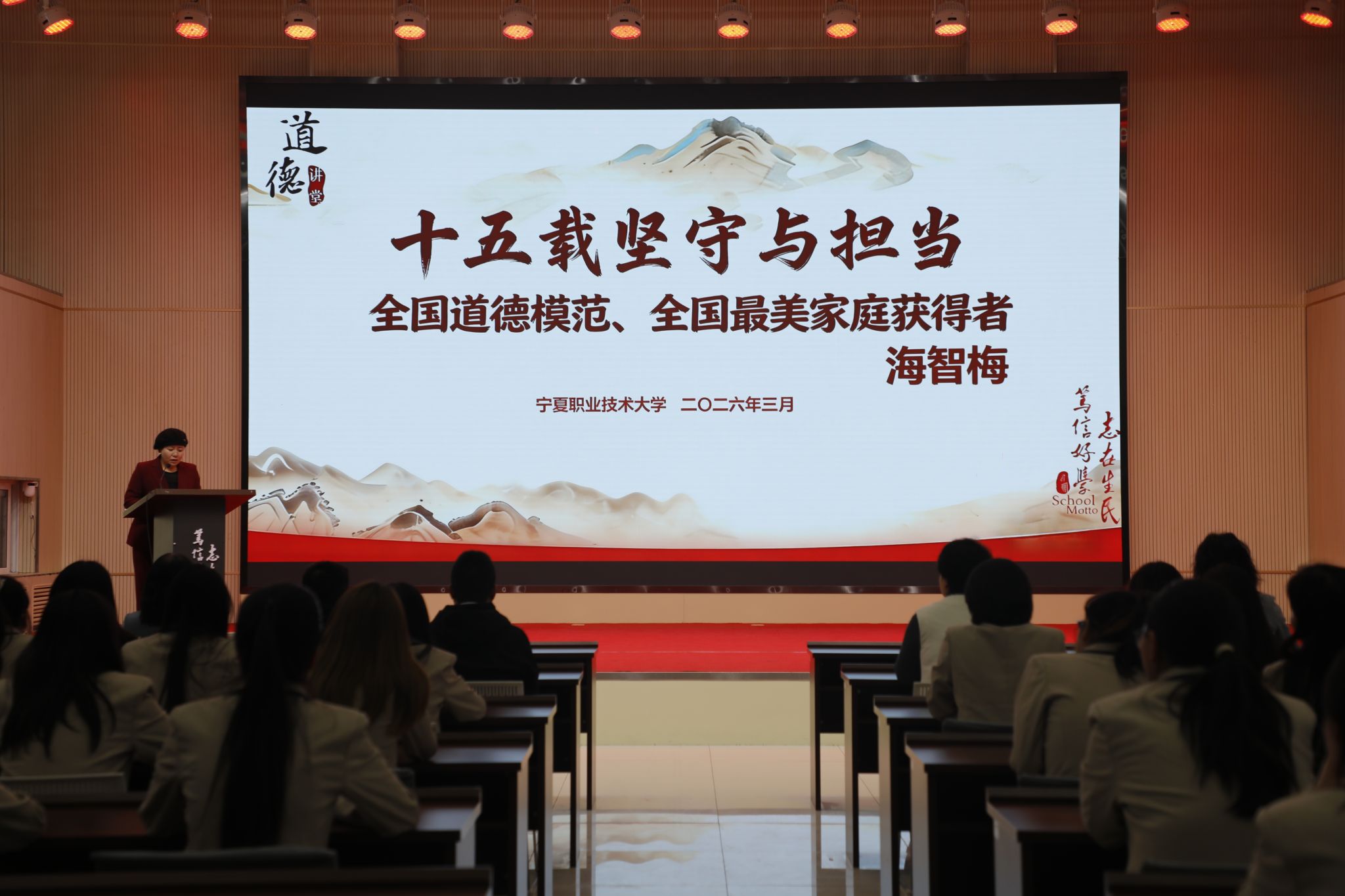 3月24日下午,学校现代农业综合实训中心二楼报告厅内掌声阵阵、暖意融融。由宣传统战部、工会和健康管理与社会服务学院联合主办的第68期道德讲堂如期开讲。本次道德讲堂以“微光成炬 向光而行”为主题,特邀第九届全国道德模范、全国最美家庭获得者海智梅作先进事迹报告。学校党委副书记苏晓军出席并致辞,监察专员办公室、宣传统战部、学生工作部、工会相关负责人、健康管理与社会服务学院师生代表等200余人参加活动。