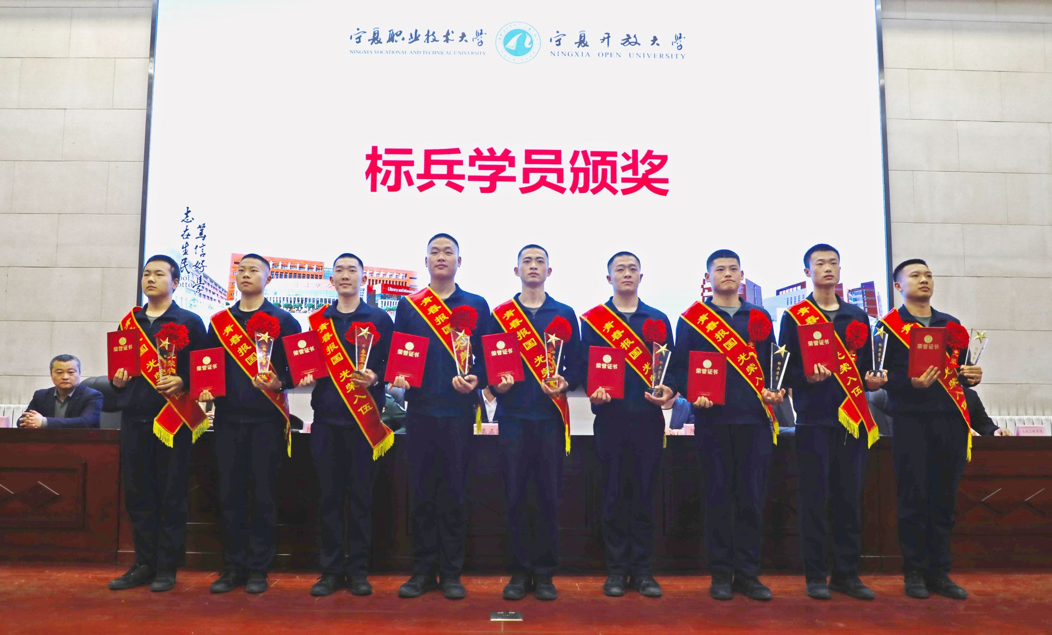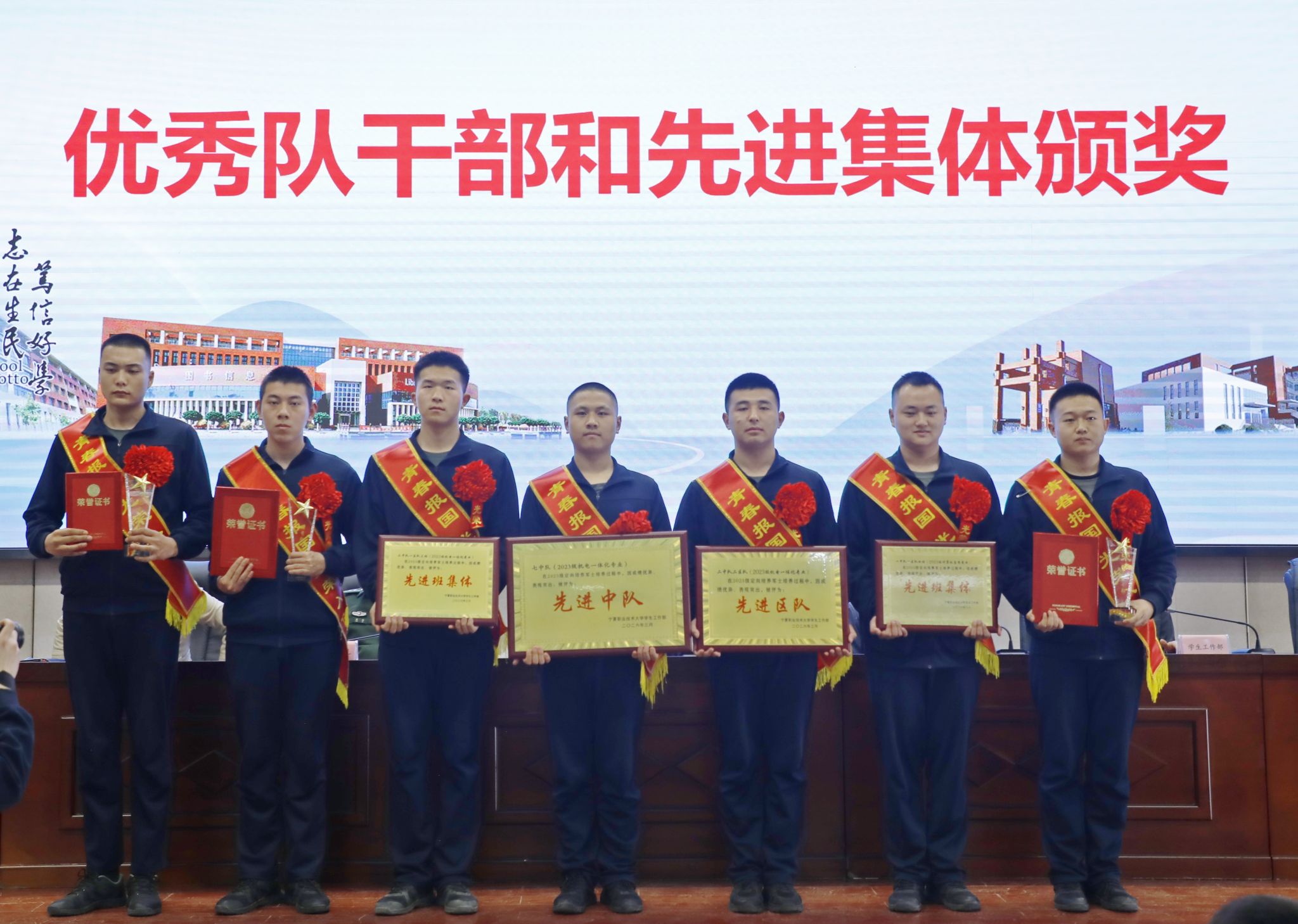 春风催征鼓,戎装赴新程。3月25日下午,我校隆重举行2023级定向培养军士表彰暨入伍欢送大会,126名定向培养军士身披绶带、精神抖擞,在师长、亲友的共同见证下,即将告别校园,奔赴国防强军一线。学校校长袁正国、副校长陈灿、银川市西夏区武装部部长陈科出席大会,学生工作部、教务处、工业工程学院、软件学院相关负责人,教师代表及家长代表共同参会,大会由学校副校长陈灿主持。